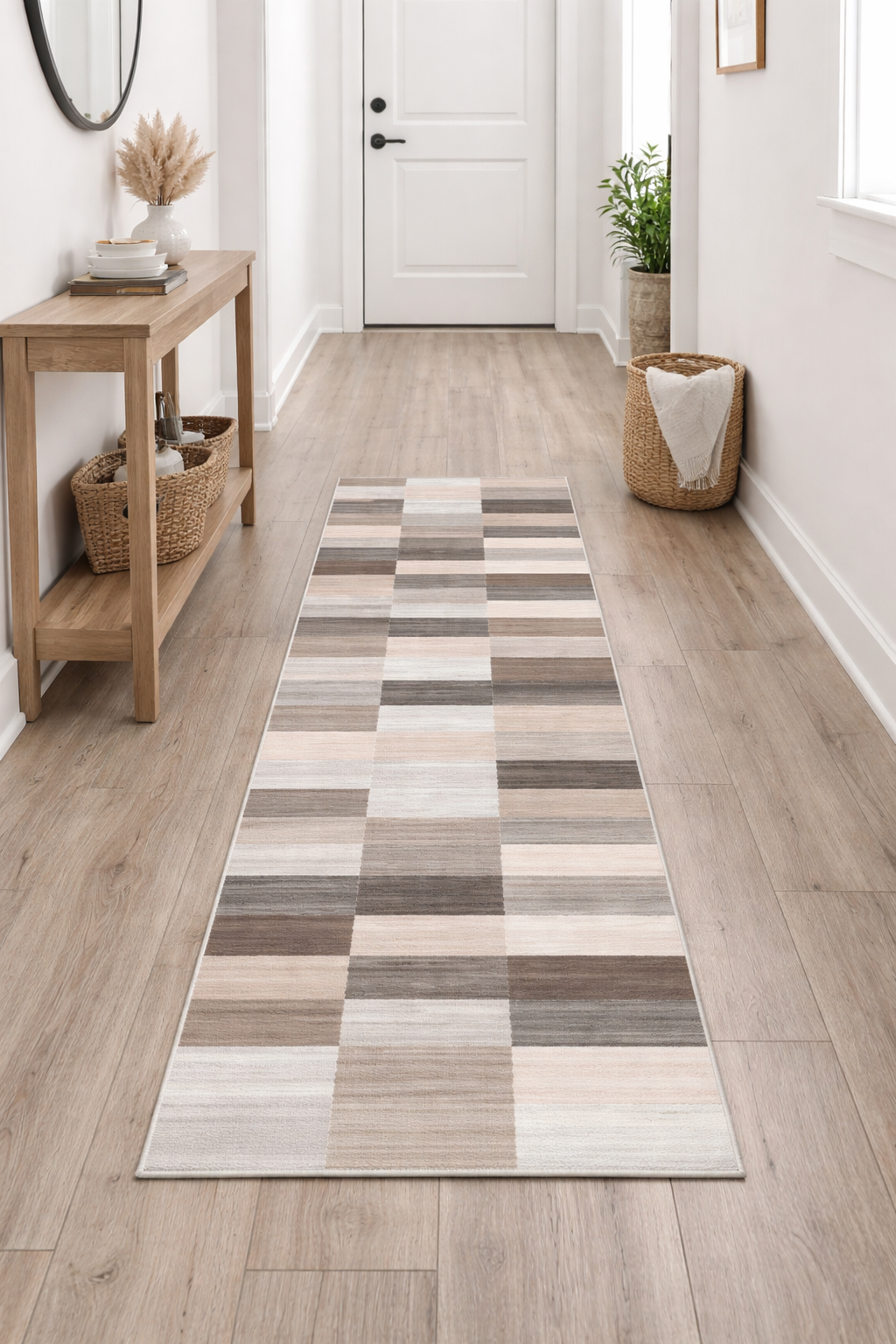 Елегантна пътека с модерен абстрактен дизайн, съчетаващ правоъгълни форми в неутрални нюанси на бежово, кафяво и сиво. Балансираната цветова комбинация създава спокойна и стилна визия, подходяща за съвременни интериори.