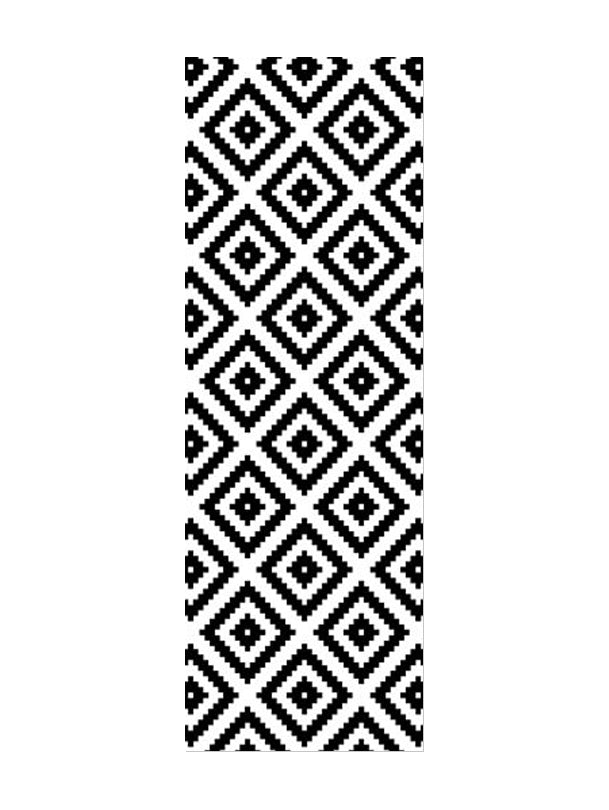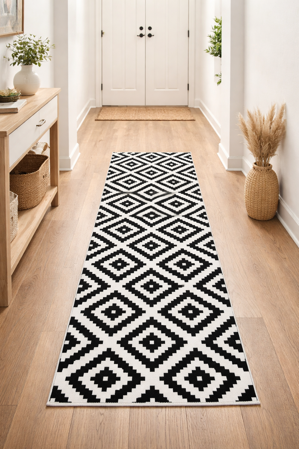 Модерна пътека в скандинавски стил с изчистен геометричен десен в контрастни бяло и черно. Повтарящите се ромбовидни форми създават усещане за ритъм и баланс, което прави този модел идеален за минималистични и съвременни интериори.