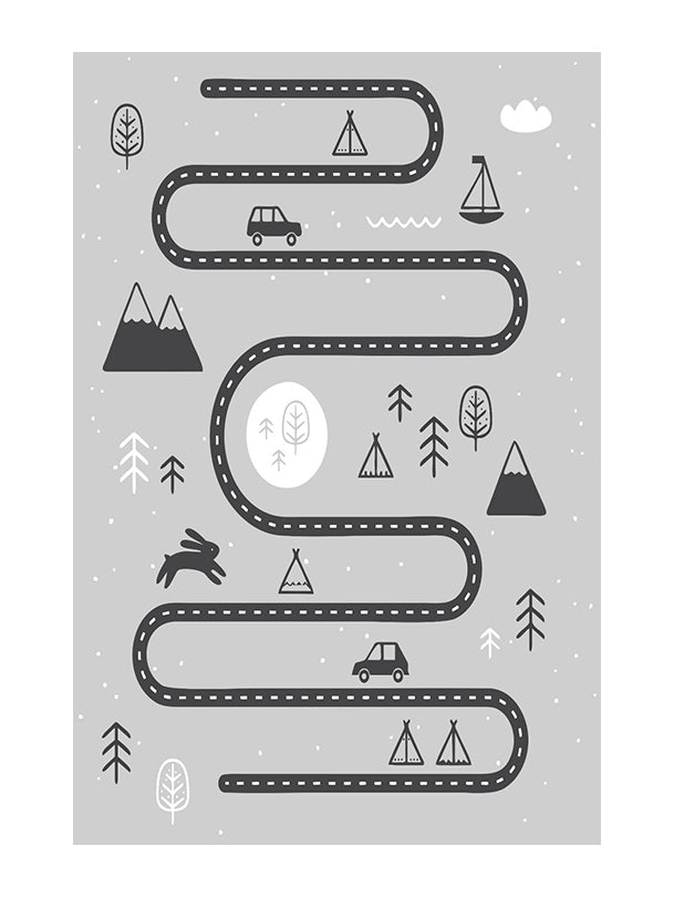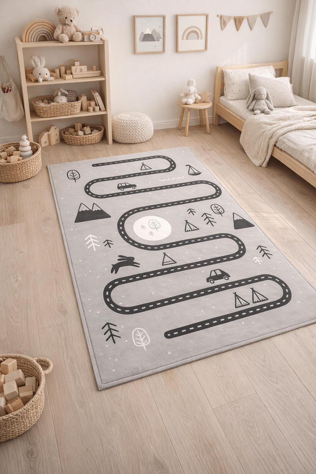 Стилен детски килим в сиво, вдъхновен от скандинавския дизайн. Изчистените линии, пътят с извивки и илюстрациите на дървета, планини и животни създават спокойна и модерна атмосфера в детската стая. Унисекс визията го прави подходящ както за момчета, така и за момичета, а дизайнът стимулира въображението и играта.